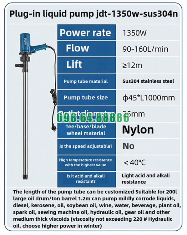 Thông số Máy bơm hút thùng phuy cắm điện JDT- 1350W- SUS304N