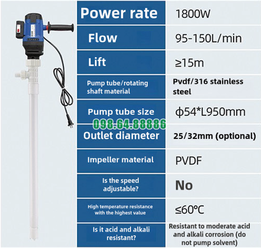 Nhờ sự kết hợp giữa động cơ mạnh mẽ, thiết kế bền bỉ và khả năng vận hành ổn định, Máy bơm điện bơm chất lỏng thùng phuy JDT-1800W-PVDF trở thành lựa chọn đáng tin cậy cho các doanh nghiệp cần thiết bị bơm chất lỏng hiệu quả trong môi trường công nghiệp.