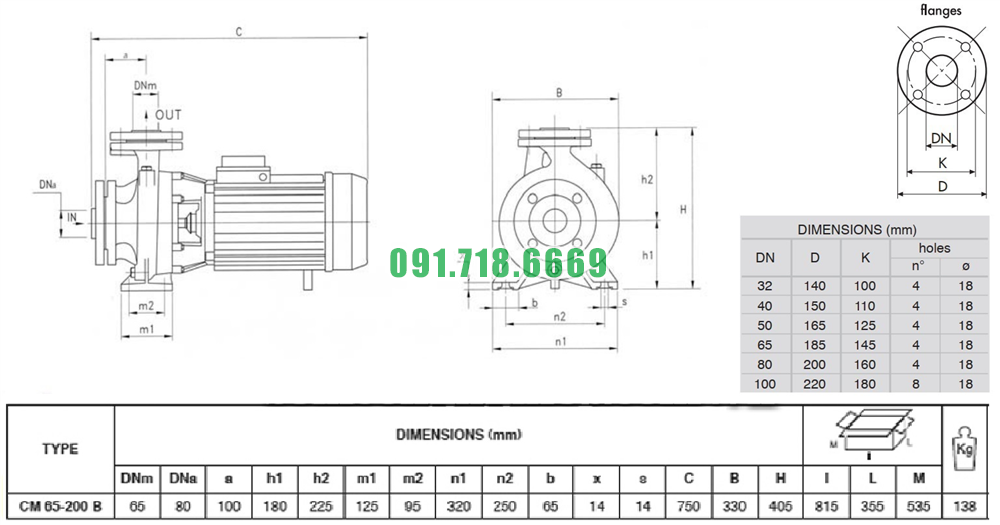 Kích thước máy bơm nước li tâm CM65-200B vật liệu gang FC200
