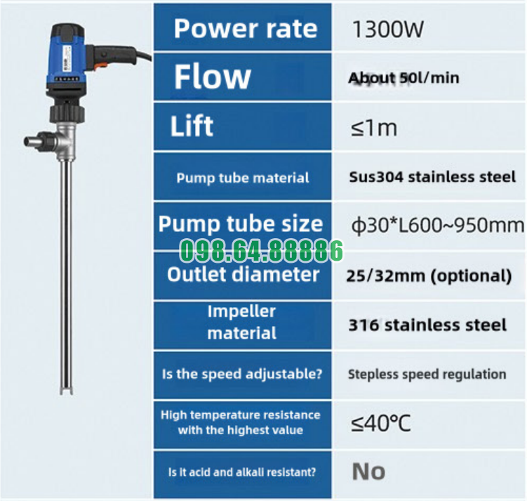 Trục bơm dài cho phép Bơm thùng phuy JDT-1300W-30 SUS304 hút hóa chất trực tiếp từ đáy thùng phuy. Điều này giúp giảm tồn dư hóa chất trong thùng, hạn chế lãng phí và giảm nguy cơ tiếp xúc hóa chất trong quá trình xử lý thủ công phần còn lại.