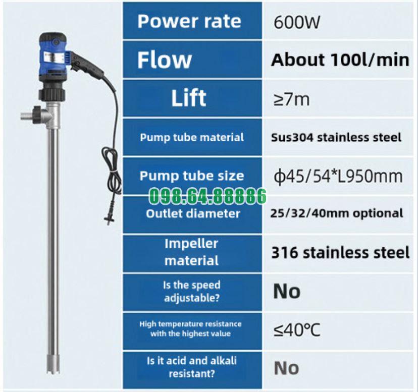 Bơm chất lỏng không nhớt thùng phuy model JDT-600W-304SUS