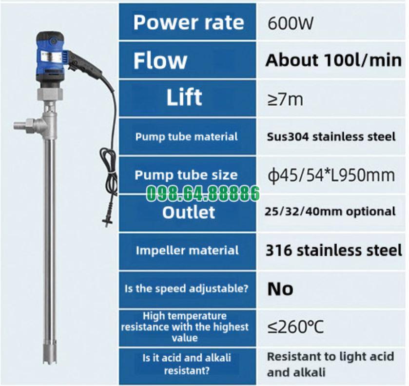 Thông số bơm hút thùng phuy nhiệt độ cao JDT-600W-G260
