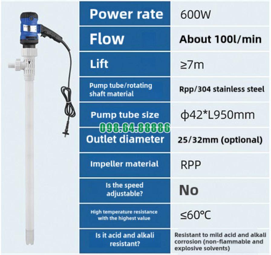Máy bơm điện nhúng chất lỏng JDT-600W-RPP được thiết kế để vận hành ổn định trong môi trường ẩm, ngập nước hoặc chứa hóa chất ăn mòn. Với cấu trúc kín hoàn toàn và phớt cơ khí kép, máy đảm bảo không rò điện, không thấm nước, duy trì hiệu suất cao ngay cả khi làm việc liên tục trong điều kiện công nghiệp nặng.