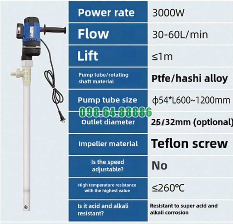 Trong nhiều ứng dụng công nghiệp, đặc biệt là khi bơm dầu nóng hoặc hóa chất có nhiệt độ cao, thiết bị bơm cần có khả năng chịu nhiệt tốt để đảm bảo vận hành ổn định. Bơm hút dầu nhớt thùng phuy JDT-3000W-PTFELG sở hữu khả năng chịu nhiệt độ lên tới 260°C, giúp thiết bị hoạt động hiệu quả trong môi trường nhiệt độ cao.