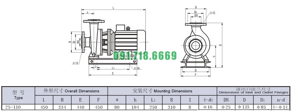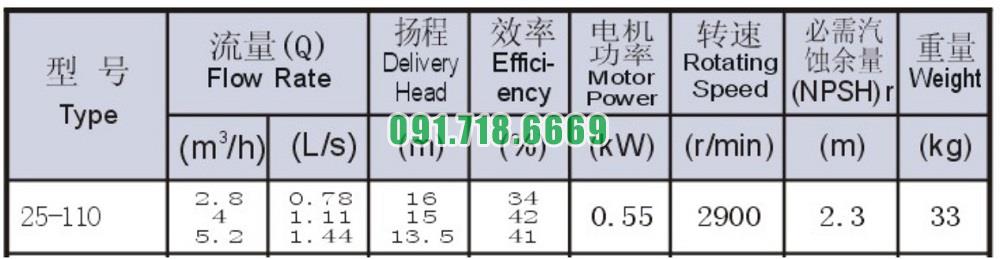 Bơm li tâm trục ngang ISW25-110 công suất 0.55 kw lưu lượng 5.2 m3/h