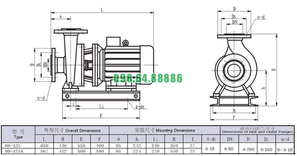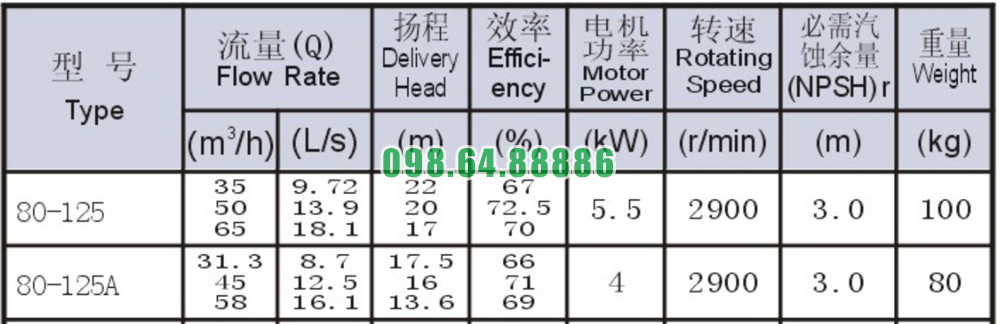 Bảng thông số kỹ thuật bơm li tâm trục ngang model SLW80-ISW80-125 công suất 18.1 L/s