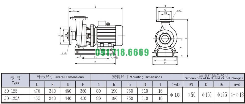 Bản vẽ cấu tạo và kích thước bơm li tâm trục ngang SLW-ISW50-125 động cơ 1.5 kw năng suất 57%