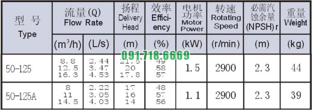 Bảng thông số kỹ thuật bơm li tâm trục ngang SLW-ISW50-125 động cơ 1.5 kw năng suất 57%