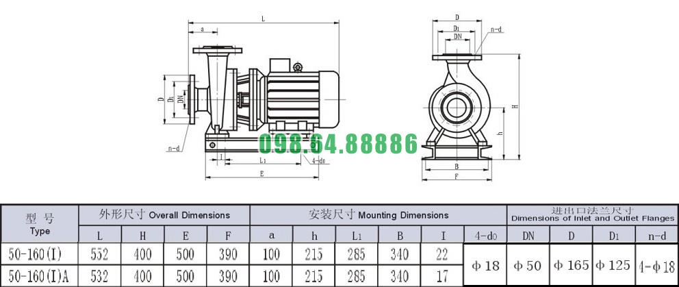 Bản vẽ cấu tạo và kích thước bơm li tâm trục ngang SLW-ISW50-160-I đẩy cao 34.4m và hút sâu 2.5m