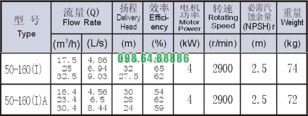 Bảng thông số kỹ thuật bơm li tâm trục ngang SLW-ISW50-160-I đẩy cao 34.4m và hút sâu 2.5m