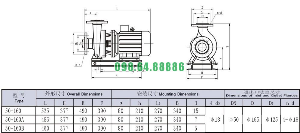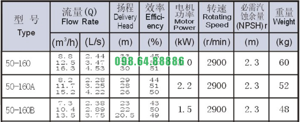 Bảng thông số kỹ thuật bơm li tâm trục ngang SLW-ISW50-160