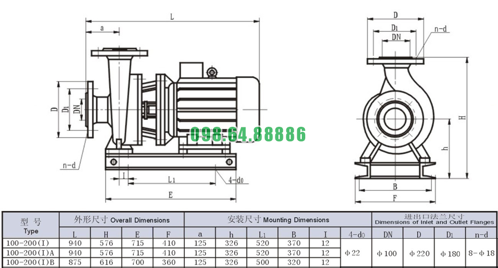 Bản vẽ cấu tạo và kích thước bơm li tâm trục ngang SLW100-ISW100-200-I lưu lượng 53.3 L/s hoặc 192 m3/h