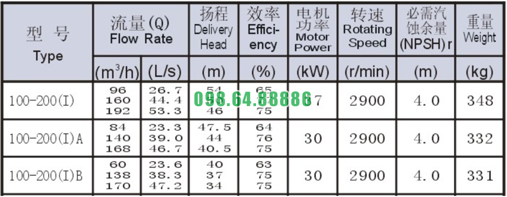 Bảng thông số kỹ thuật bơm li tâm trục ngang SLW100-ISW100-200-I lưu lượng 53.3 L/s hoặc 192 m3/h