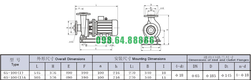 Bản vẽ cấu tạo và kích thước bơm li tâm trục ngang SLW65-ISW65-125-I động cơ 5.5 kw năng suất 72.5%