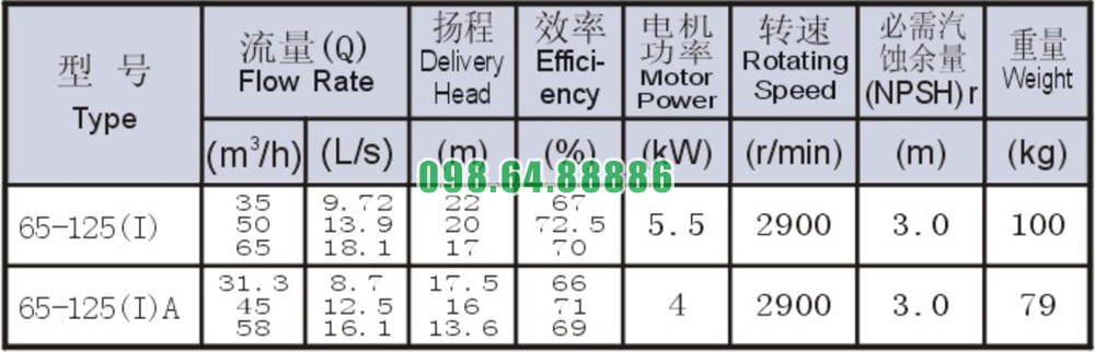 Bảng thông số kỹ thuật bơm li tâm trục ngang SLW65-ISW65-125-I động cơ 5.5 kw năng suất 72.5%