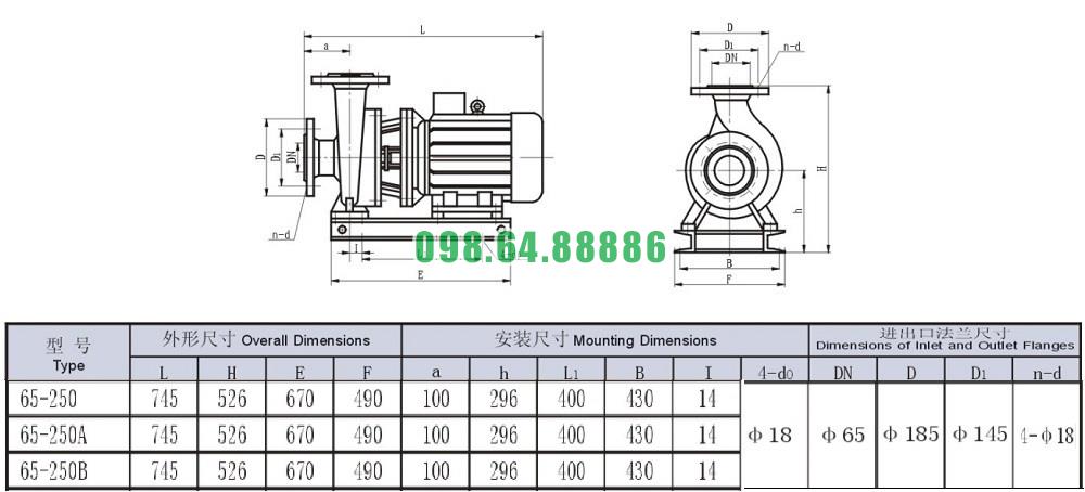 Bản vẽ cấu tạo và kích thước bơm li tâm trục ngang SLW65-ISW65-250 động cơ 15 kw năng suất 52%