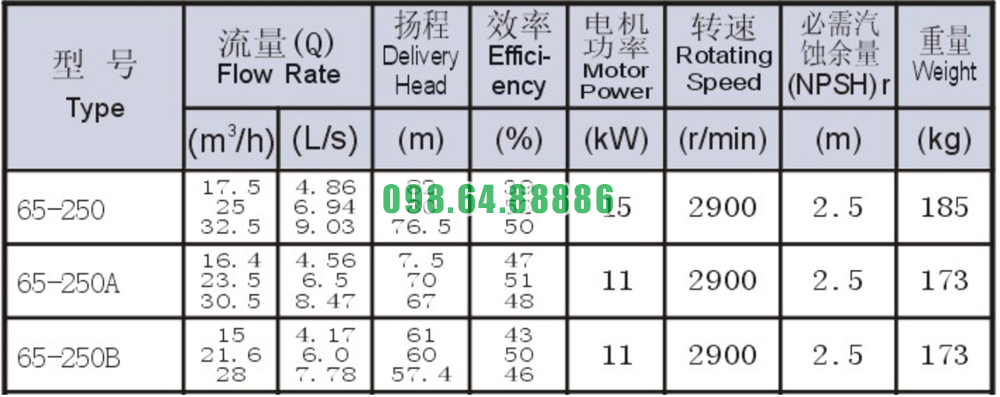 Bảng thông số kỹ thuật bơm li tâm trục ngang SLW65-ISW65-250 động cơ 15 kw năng suất 52%
