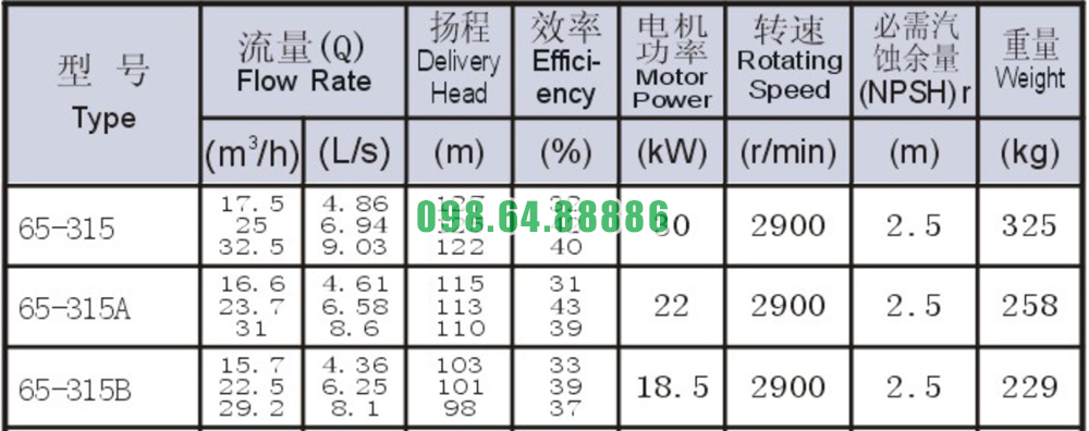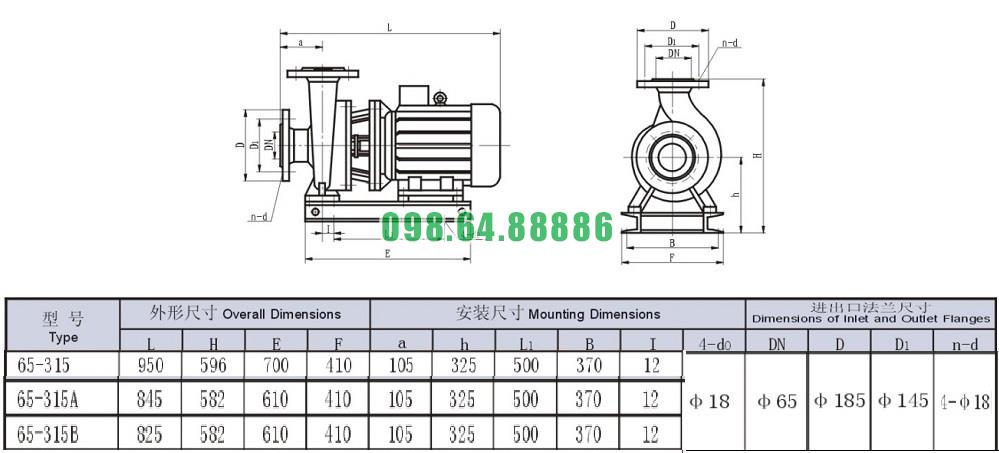 Bảng thông số kỹ thuật bơm li tâm trục ngang SLW65-ISW65-315 đẩy cao 127m và hút sâu 2.5m