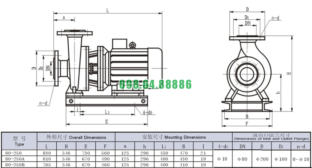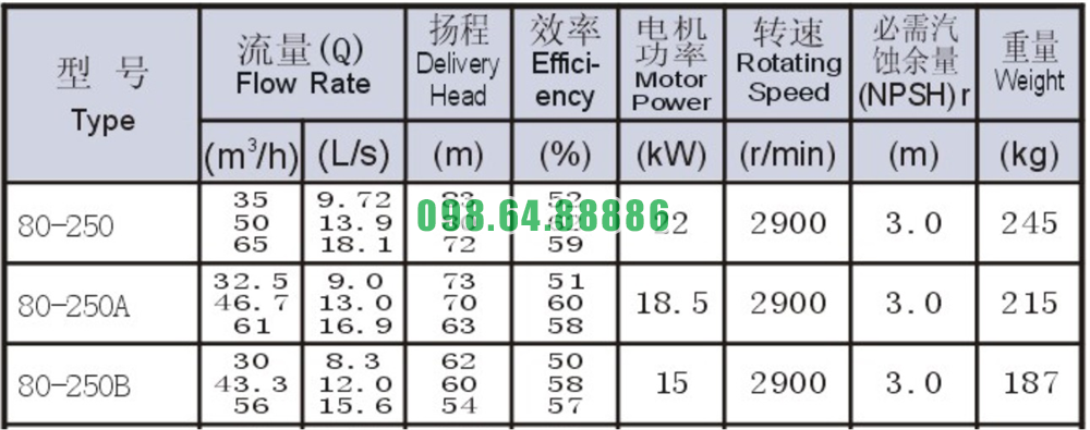 Bảng thông số kỹ thuật bơm li tâm trục ngang SLW80-ISW80-250 đẩy cao 83m và hút sâu 3m