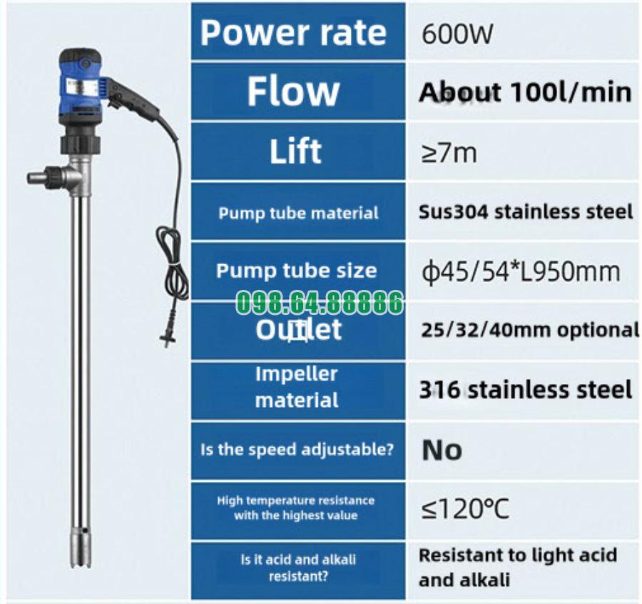 Bơm thùng phuy nhựa RPP JDT-G120-600W có trọng lượng nhẹ nhờ sử dụng vật liệu RPP và cấu trúc ống bơm thẳng, giúp người vận hành dễ dàng cầm, đặt vào thùng phuy hoặc di chuyển giữa các thùng khác nhau. Kích thước gọn gàng giúp thao tác linh hoạt ngay cả trong không gian nhà xưởng hẹp.