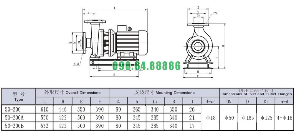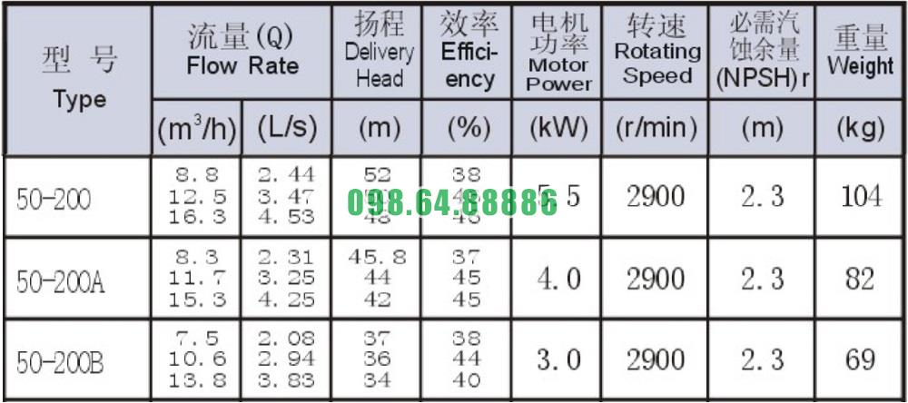 Bảng thông số kỹ thuật bơm nước nằm ngang mã SLW-ISW50-200 động cơ 5.5 kw