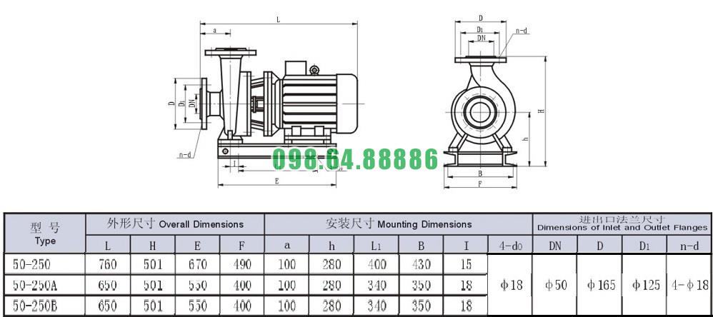 Bản vẽ cấu tạo và kích thước bơm nước nằm ngang SLW-ISW50-250 độ hút sâu 2.3m