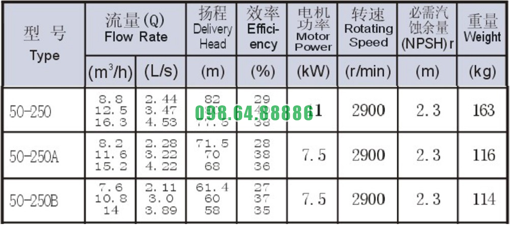 Bảng thông số kỹ thuật bơm nước nằm ngang SLW-ISW50-250 độ hút sâu 2.3m