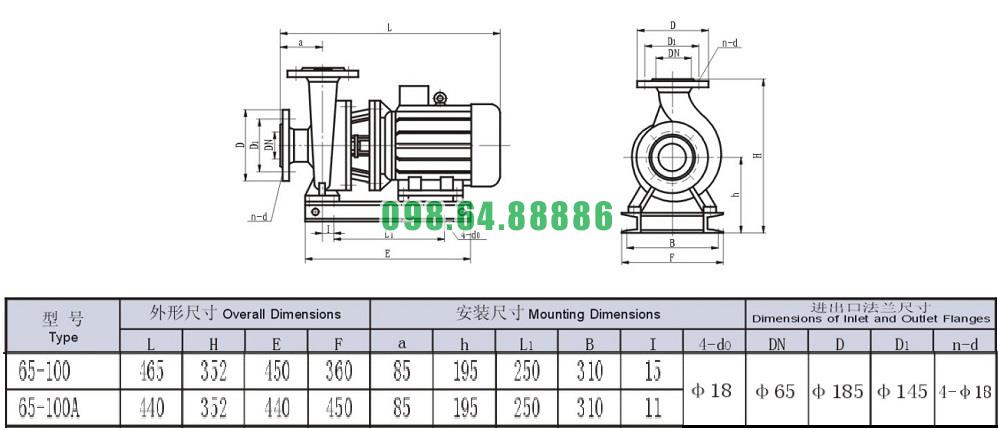 Bản vẽ cấu tạo và kích thước bơm nước nằm ngang SLW-ISW65-100 năng suất từ 67% - 67%