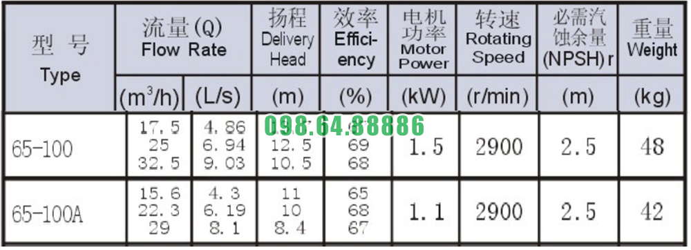 Bảng thông số kỹ thuật bơm nước nằm ngang SLW-ISW65-100 năng suất từ 67% - 67%