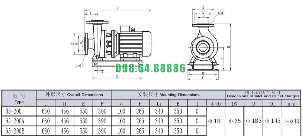 Bản vẽ cấu tạo và kích thước bơm nước nằm ngang SLW-ISW65-200 hiệu suất 17.5 m3/h - 32.5 m3/h