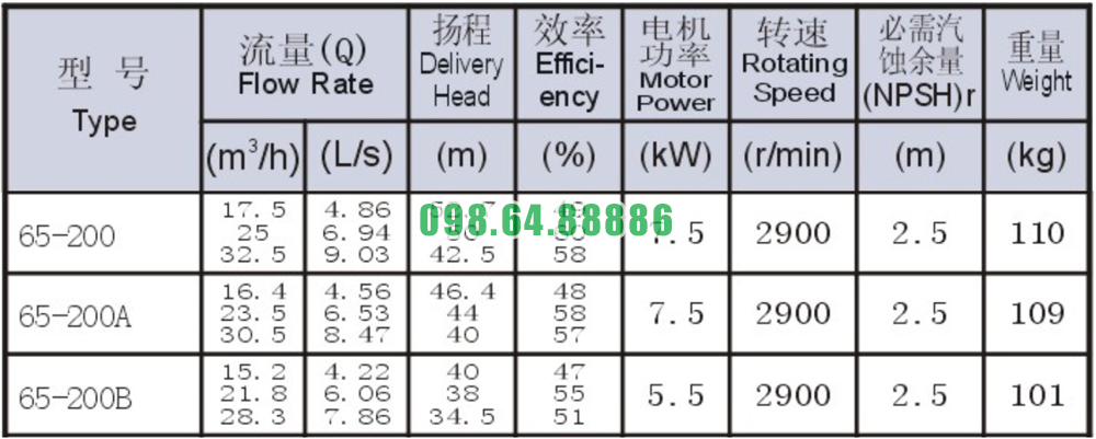 Bảng thông số kỹ thuật bơm nước nằm ngang SLW-ISW65-200 hiệu suất 17.5 m3/h - 32.5 m3/h