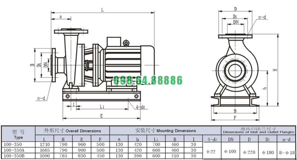 Bản vẽ cấu tạo và kích thước bơm nước nằm ngang SLW100-ISW100-350 hiệu suất 70 m3/h - 120 m3/h