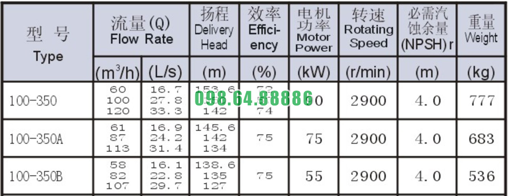 Bảng thông số kỹ thuật bơm nước nằm ngang SLW100-ISW100-350 hiệu suất 70 m3/h - 120 m3/h