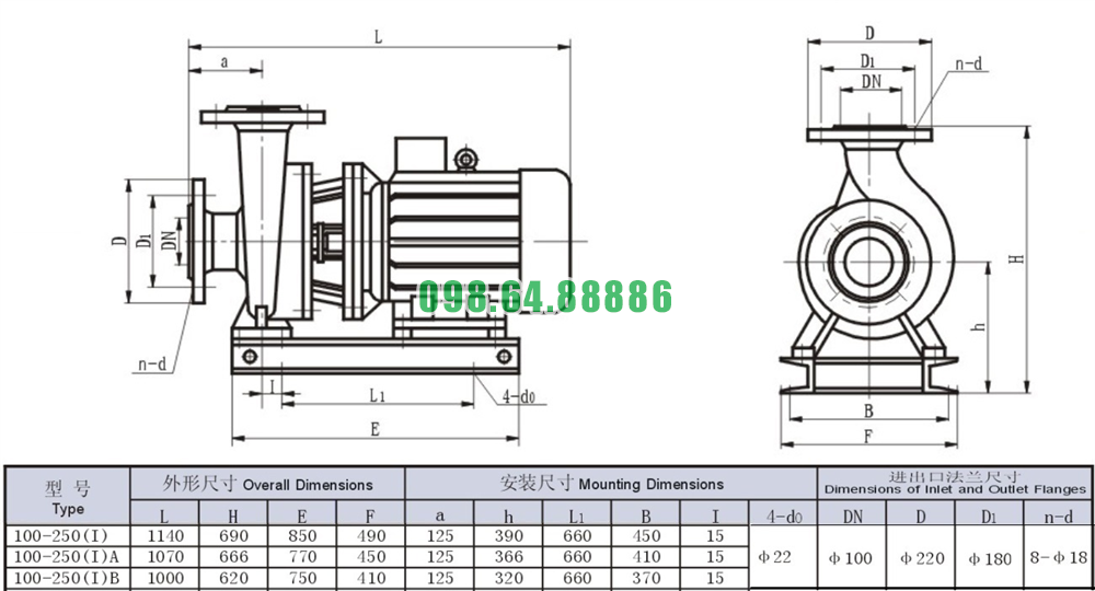 Bản vẽ cấu tạo và kích thước bơm nước nằm ngang SLW100-ISW100-250-I đẩy cao từ 72m- 83m