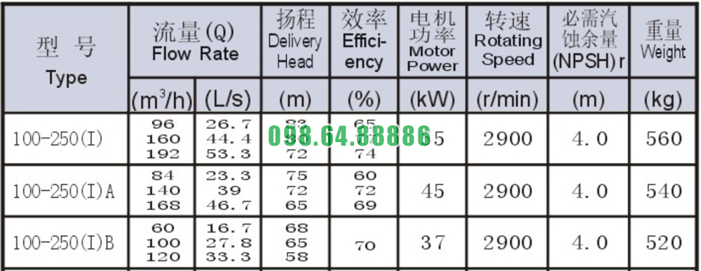 Bảng thông số kỹ thuật bơm nước nằm ngang SLW100-ISW100-250-I đẩy cao từ 72m- 83m