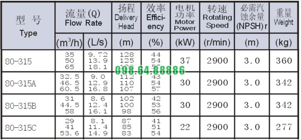 Bảng thông số kỹ thuật bơm nước nằm ngang SLW80-ISW80-315 độ hút sâu 3m