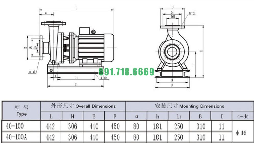 Bản vẽ cấu tạo và kích thước bơm nước trục ngang SLW-ISW40-100 khối lượng 34 kg