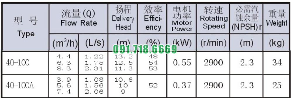 Bảng thông số kỹ thuật bơm nước trục ngang SLW-ISW40-100 khối lượng 34 kg