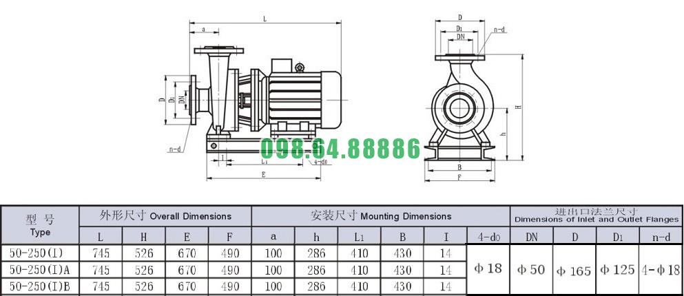 Bản vẽ cấu tạo và kích thước bơm nước trục ngang SLW-ISW50-250-I động cơ 5.5 kw