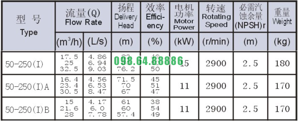 Bảng thông số kỹ thuật bơm nước trục ngang SLW-ISW50-250-I động cơ 5.5 kw