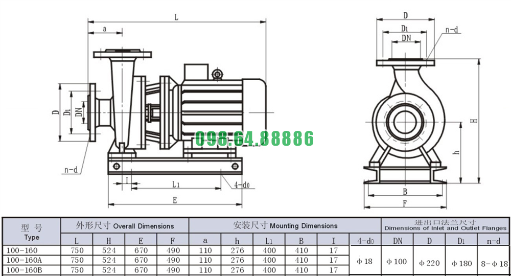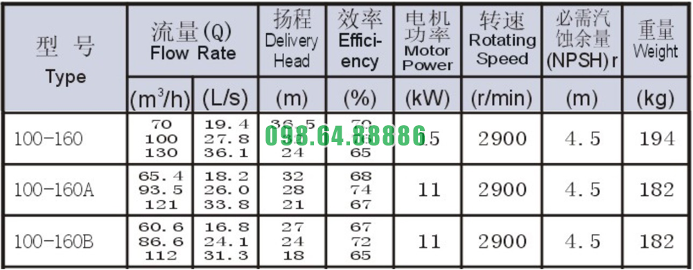 Bảng thông số kỹ thuật bơm nước trục ngang SLW100-ISW100-160 hiệu năng 76%