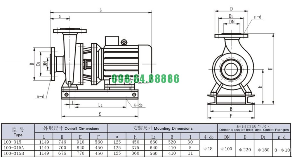 Bản vẽ cấu tạo và kích thước bơm nước trục ngang SLW100-ISW100-315 hiệu năng 67%