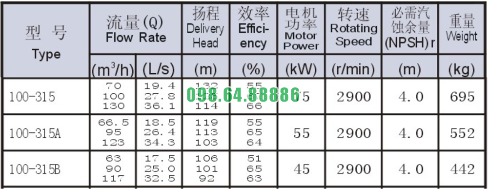 Bảng thông số kỹ thuật bơm nước trục ngang SLW100-ISW100-315 hiệu năng 67%