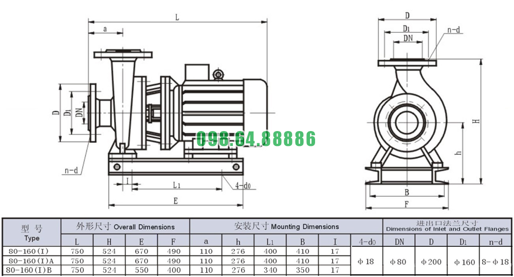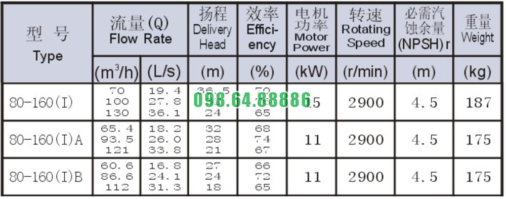 Bảng thông số kỹ thuật bơm nước trục ngang SLW80-ISW80-160-I hiệu suất max 130 m3/h