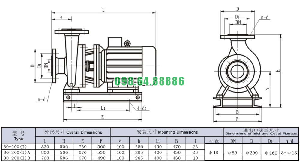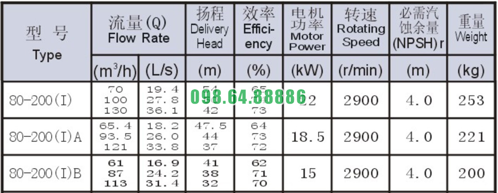 Bảng thông số kỹ thuật bơm nước trục ngang SLW80-ISW80-200-I khối lượng 253 kg