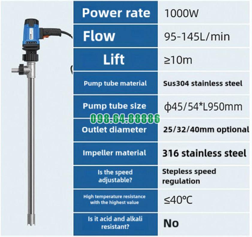 Bơm cắm điện thùng phuy JDT-1000W-304SUS được sử dụng để sang chiết chất lỏng từ thùng phuy sang bồn chứa hoặc hệ thống cấp liệu, đảm bảo dòng chảy liên tục và không gián đoạn.