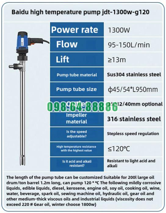 Bơm thùng phuy nhiệt độ cao JDT-1300W-G120 mang lại hiệu suất làm việc tối đa