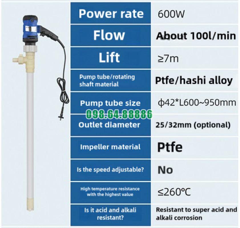 Bơm thùng phuy cho dung dịch mạ, axit – kiềm model JDT-600W-PTFE