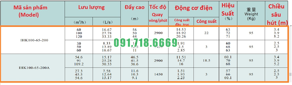 Bảng lưu lượng của máy bơm nước li tâm cánh hở IHK100-65-200 làm bằng inox