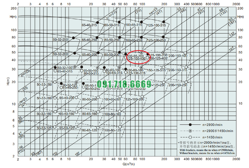 Đường cong hiệu suất của máy bơm nước li tâm cánh hở IHK100-65-200 làm bằng inox